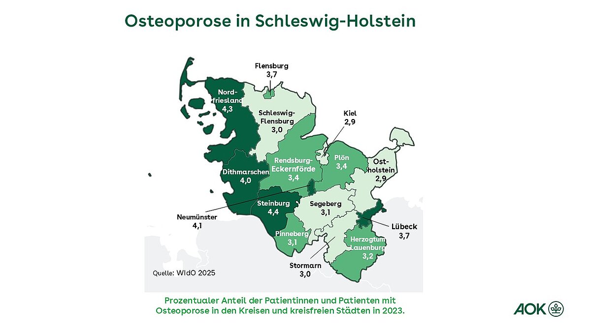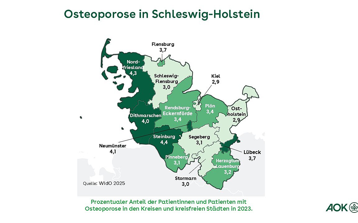 Kiel. In Schleswig-Holstein waren 64.400 Menschen ab 35 Jahren im Jahr 2023 von einer Osteoporose (Knochenschwund) betroffen und befanden sich deshalb in ärztlicher Behandlung. Das entspricht 3,4 Prozent der Bevölkerung im nördlichsten Bundesland. Zwischen den Regionen gibt es jedoch große Unterschiede. Das geht aus dem aktuellen ‚AOK-Gesundheitsatlas Osteoporose‘ des Wissenschaftlichen Instituts der AOK Die AOK hat mit mehr als 20,9 Millionen Mitgliedern (Stand November 2021) als zweistärkste Kassenart… (WIdO Das WIdO (Wissenschaftliches Institut der AOK) liefert als Forschungs- und Beratungsinstitut der… ) hervor, der heute in Kiel im Vorfeld des Welt-Osteoporose-Tages am 20. Oktober vorgestellt wurde. „Die oft unerkannte Osteoporose gehört zu den häufigsten Muskel-Skelett-Erkrankungen und stellt vor allem für hochaltrige Frauen ein großes gesundheitliches Problem dar. Am besten ist es, Osteoporose schon im Kindesalter mit einer gesunden Lebensweise vorzubeugen“, sagte Tom Ackermann, Vorstandsvorsitzender der AOK NordWest.