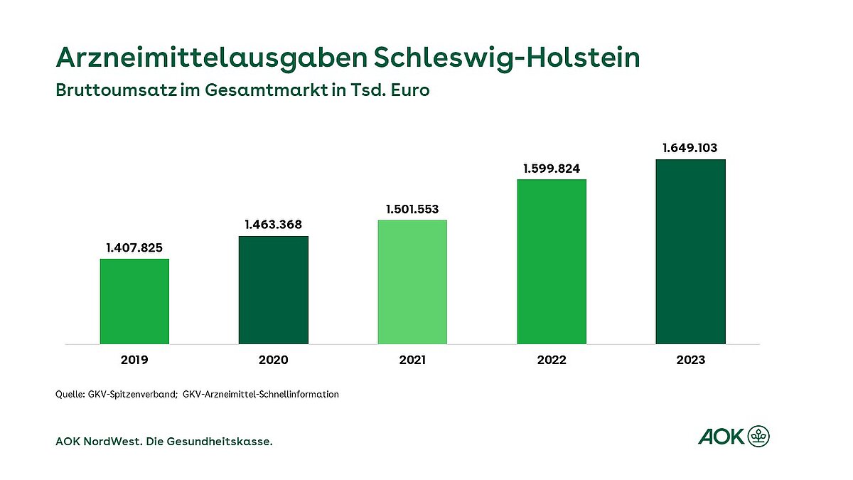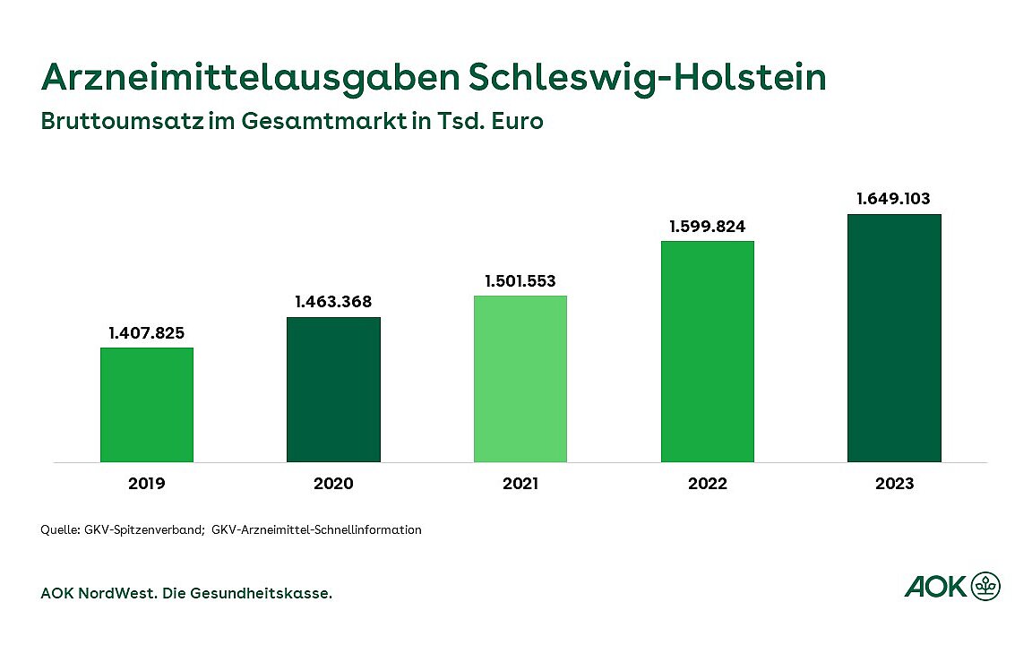 Kiel. Die Ausgaben für Arzneimittel Nach der Definition des Arzneimittelgesetzes (AMG) sind Arzneimittel insbesondere Stoffe und… sind in Schleswig-Holstein erneut deutlich gestiegen: Im vergangenen Jahr erhielten die rund 2,5 Millionen gesetzlich Versicherten Medikamente im Wert von fast 1,65 Milliarden Euro. Das ist ein Anstieg im Vergleich zum Vorjahr von 3,1 Prozent, gegenüber 2021 sogar um 9,8 Prozent. Dies teilte heute die AOK Die AOK hat mit mehr als 20,9 Millionen Mitgliedern (Stand November 2021) als zweistärkste Kassenart… NordWest auf Basis der aktuellen Statistiken des GKV-Spitzenverbandes mit. „Zentrale Kostentreiber sind nach wie vor die hochpreisigen patentgeschützten Arzneimittel. Hier muss die Ampel-Koalition dringend gegensteuern, um die anhaltend hohen Ausgabensteigerungen bei Arzneimitteln abzubremsen“, sagt AOK-Vorstandsvorsitzender Tom Ackermann. Im Durchschnitt bekam 2023 jeder gesetzlich Versicherte in Schleswig-Holstein Arzneimittel für rund 652 Euro verordnet.