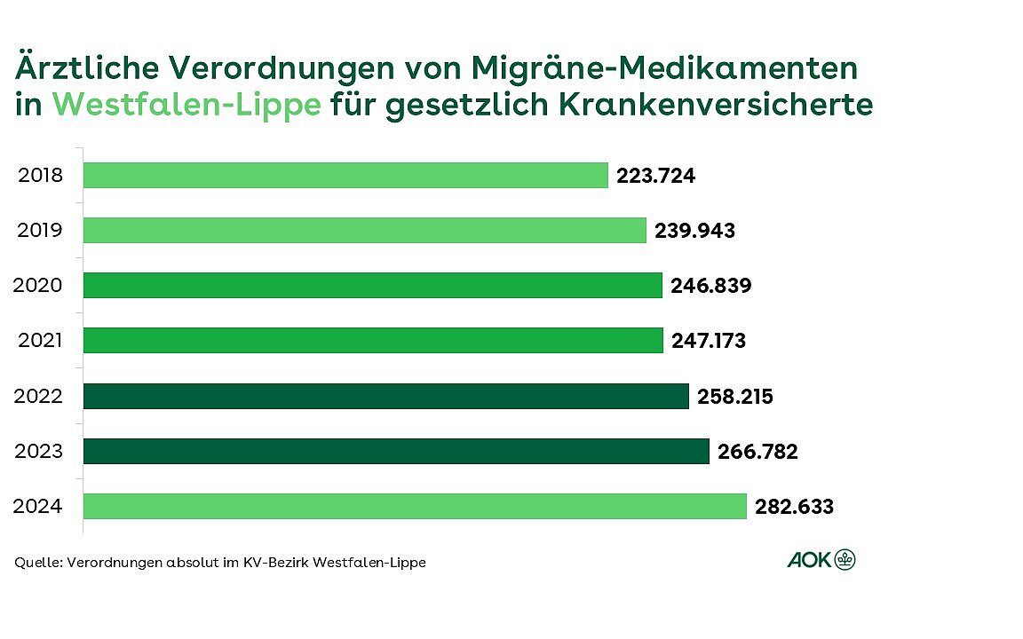 Dortmund. In Westfalen-Lippe sind die Ausgaben für Migränemittel weiter deutlich angestiegen und haben einen neuen Höchstwert erreicht. Das belegt eine aktuelle Auswertung der AOK NordWest. Danach verordneten die niedergelassenen Ärztinnen und Ärzte im Jahr 2024 für alle gesetzlich Krankenversicherten in Westfalen-Lippe Migränemedikamente im Wert von über 29,7 Millionen Euro. Das ist ein Plus im Vergleich zum Vorjahr um 18 Prozent. Gegenüber 2018 haben sich die Ausgaben sogar fast vervierfacht. „Die Migräne-Therapie gehört in fachärztliche Hände. Allerdings bekommen immer mehr Migränepatienten neue Arzneimittel zur Vorbeugung von Migräne verordnet. Im ersten Halbjahr 2019 kamen diese neuen Wirkstoffe zur Migräneprophylaxe auf den Markt. Der Verordnungsanteil ist zwar gering, sie sind aber ein enormer Kostentreiber“, sagt AOK-Vorstandschef Tom Ackermann.