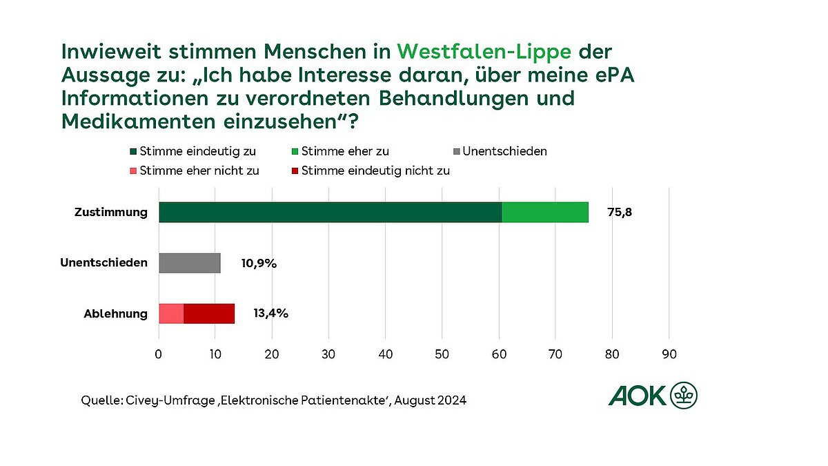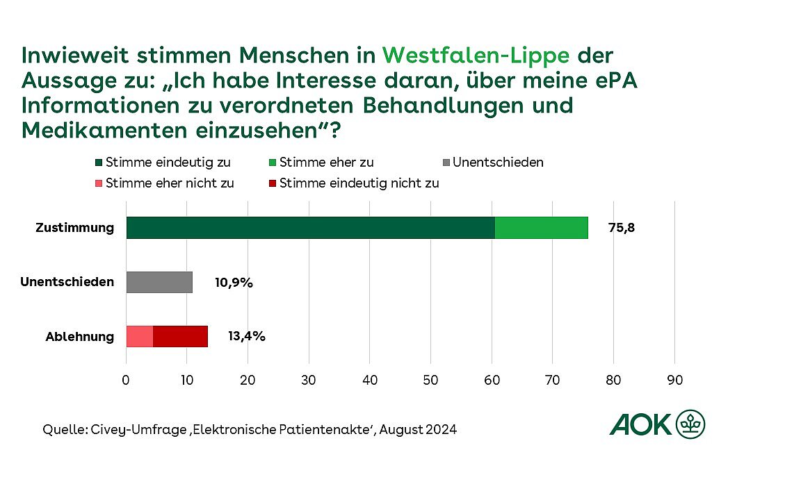 Ähnlich groß ist nach den aktuellen Umfrage-Ergebnissen die Zustimmung zu der Aussage „Ich habe Interesse daran, über die elektronische Patientenakte Mit der ePA können Patientinnen und Patienten sowie die an Ihrer Behandlung beteiligten Ärztinnen… Informationen zu verordneten Behandlungen und Medikamenten einzusehen.“ Hier äußern sich 76 Prozent der Befragten in Westfalen-Lippe positiv, 13 Prozent ablehnend und elf Prozent unentschieden.