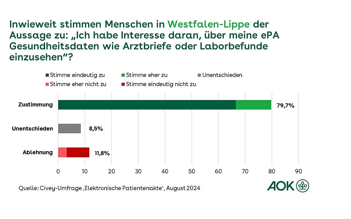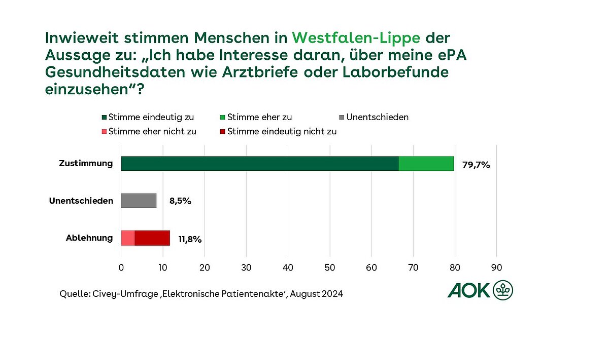 Dortmund. Auf großes Interesse in der Bevölkerung in Westfalen-Lippe stoßen die Inhalte und Funktionen der neuen elektronische Patientenakte (ePA), die im Januar 2025 eingeführt wird. Das ist das Ergebnis einer repräsentativen Civey-Umfrage, die im Auftrag der AOK im August unter 10.000 Personen bundesweit durchgeführt wurde, davon 1.584 in Westfalen-Lippe. So äußern 80 Prozent der Befragten in Westfalen-Lippe Interesse daran, über ihre ePA künftig Gesundheitsdaten wie Arztbriefe oder Labordaten einzusehen. Knapp zwölf Prozent haben daran kein Interesse, acht Prozent sind unentschieden. Hintergrund ist, dass die ePA ab Januar 2025 automatisch für alle gesetzlich Krankenversicherten in Deutschland eingerichtet wird. Über die konkreten Inhalte und Vorteile informiert in diesen und in den kommenden Tagen und Wochen die AOK NordWest rund 1,9 Millionen Versicherte in Westfalen-Lippe per Post oder per E-Mail. „Mit der Einführung der sogenannten Opt-out-Lösung im kommenden Jahr gibt es jetzt die Chance, dass die elektronische Patientenakte flächendeckend in der Versorgung ankommt und dadurch eine große Relevanz im Praxisalltag bekommt“, sagt Tom Ackermann, Vorstandsvorsitzender der AOK NordWest.