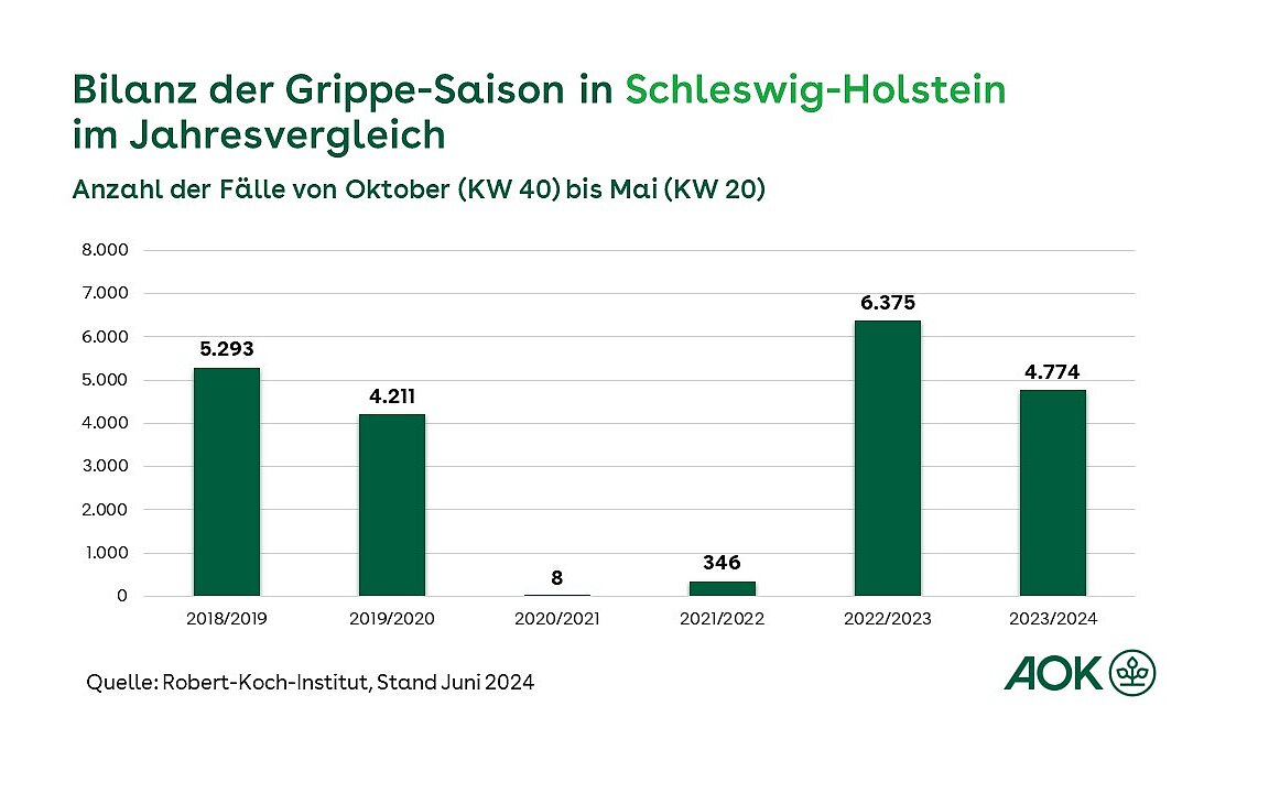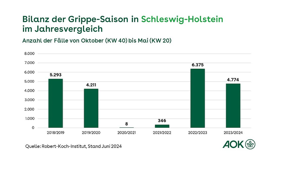 Kiel. Deutlich weniger Infektionen mit dem Grippevirus Influenza sind in der abgelaufenen Grippesaison 2023/24 in Schleswig-Holstein gemeldet worden. Im Zeitraum von Anfang Oktober 2023 bis Mitte Mai 2024 wurden insgesamt 4.774 Fälle gezählt, das sind 25,1 Prozent weniger als in der vorherigen Saison (6.375 Fälle). Das teilt die AOK NordWest auf Basis der aktuellen Zahlen des Robert-Koch-Instituts (RKI) mit. „Der deutliche Rückgang kann damit begründet werden, dass wir in der Grippesaison zuvor eine stark erhöhte Gesamtfallzahl durch den Wegfall der Schutzmaßnahmen nach der Corona-Pandemie hatten. Dadurch konnten sich die Influenzaviren nahezu ungehindert ausbreiten und damit einen gewissen Nachholeffekt begünstigen“, sagt Tom Ackermann, Vorstandsvorsitzender der AOK NordWest.