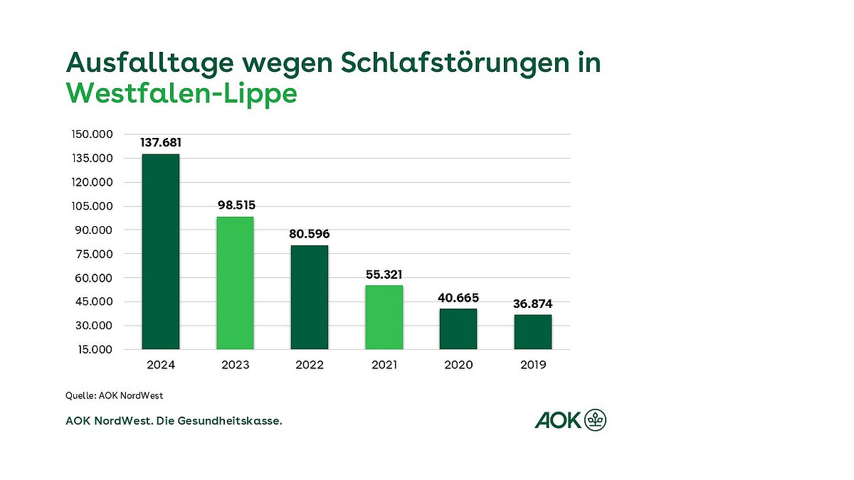 Dortmund. Die Fehlzeiten aufgrund von Schlafstörungen sind in Westfalen-Lippe im vergangenen Jahr weiter drastisch angestiegen und haben einen neuen Höchstwert erreicht. Das geht aus einer aktuellen Auswertung der AOK NordWest hervor. Danach verursachten nichtorganische Schlafstörungen bei AOK-versicherten Beschäftigten im Jahr 2024 insgesamt 137.681 Fehltage. Das sind 39,8 Prozent mehr als noch 2023 mit 98.515 Ausfalltagen. Im Vergleich zu 2020 (40.665 Fehltage) hat sich die Anzahl die Krankmeldungen sogar mehr als verdreifacht. „Die deutliche Zunahme der Fehlzeiten ist eine alarmierende Entwicklung. Schlafmangel kann eine Vielzahl negativer Folgen für Körper und Psyche haben. Die Lebensqualität, die Leistungsfähigkeit und das psychische Wohlbefinden der Betroffenen werden dadurch spürbar beeinträchtigt“, sagt AOK-Vorstandschef Tom Ackermann anlässlich des Welt-Schlaftages am 14. März.