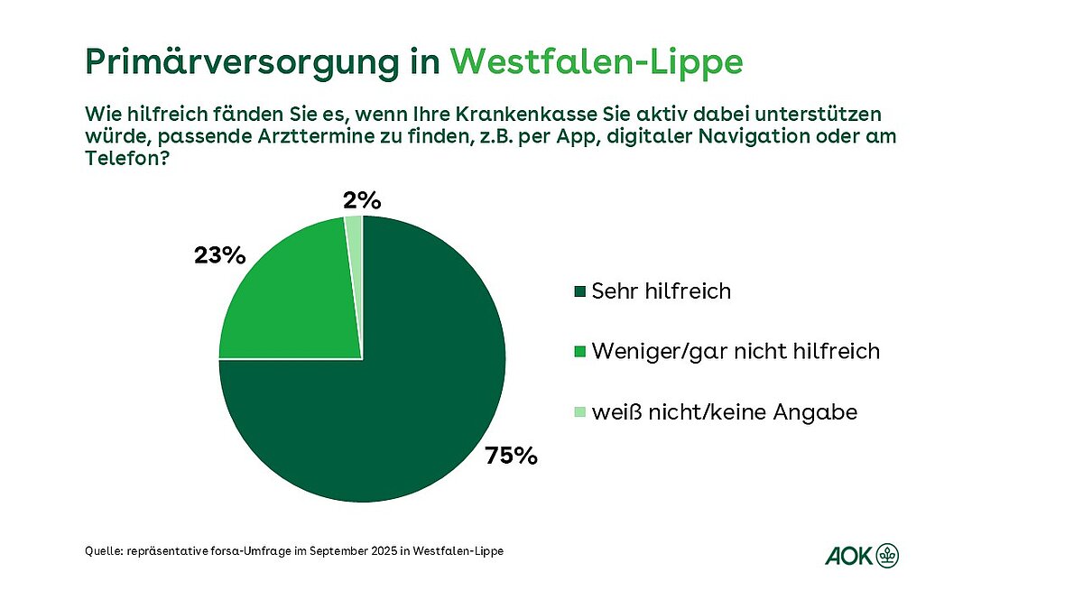 Der AOK Die AOK hat mit mehr als 20,9 Millionen Mitgliedern (Stand November 2021) als zweistärkste Kassenart… -Chef weist zudem auf die hohe Anzahl an Befragten hin, die zu 79 Prozent angegeben haben, sich eine am Bedarf ausgerichtete Terminvergabe zu wünschen. „Das macht mehr als deutlich, welche Fehlentwicklungen es aktuell bei der Terminvergabe gibt. Hier muss sich durch eine gezielte Steuerung dringend etwas ändern“, so Ackermann. Die Umfrage zeigt außerdem, dass sich 75 Prozent der befragten gesetzlich krankenversicherten Menschen in Westfalen-Lippe aktive Unterstützung bei der Terminsuche durch ihre Krankenkasse wünschen. „Wir würden es begrüßen, wenn die Krankenkassen Die 97 Krankenkassen (Stand: 26.01.22) in der gesetzlichen Krankenversicherung verteilen sich auf… künftig zu einer besseren Versorgung beitragen. Das setzt aber voraus, dass die Rahmenbedingungen dies zulassen und beispielsweise freie Termine verbindlich in einen Terminpool eingestellt werden würden“, sagt Ackermann.