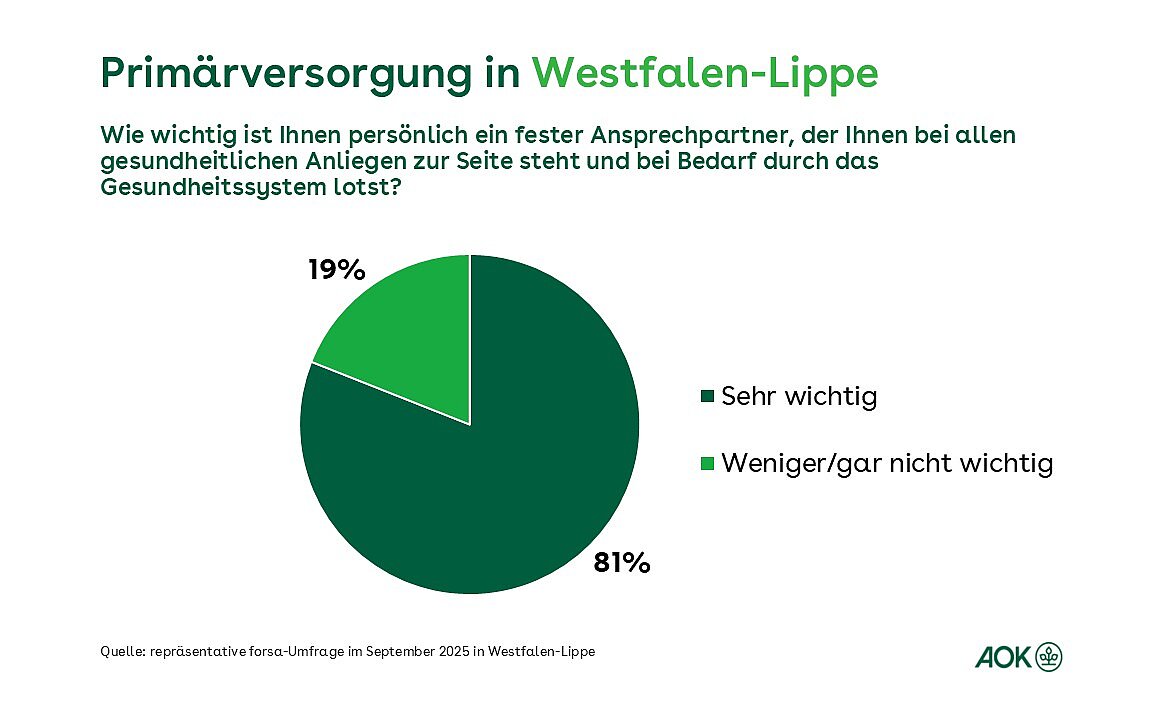 Dortmund. Sollen künftig sogenannte Primärversorgungspraxen als verlässliche Anlaufpunkte fungieren, über die der Zugang zu Fachärztinnen und -ärzten gesteuert wird? Eine aktuelle repräsentative forsa-Umfrage im Auftrag der AOK NordWest zeigt, dass eine Mehrheit von 59 Prozent der Bevölkerung in Westfalen-Lippe dem Vorschlag von Bundesgesundheitsministerin Nina Warken zustimmt. Danach sollten Facharzttermine nur nach Überweisung vergeben werden, wobei Termine bei Zahn-, Frauen- und Kinderärzten davon ausgenommen wären. „Unsere Umfrageergebnisse machen deutlich, dass die Mehrheit der Menschen die Vorschläge für eine bessere Patientensteuerung unterstützen, um eine Fehlversorgung und lange Wartezeiten zu vermeiden“, sagt AOK-Vorstandschef Tom Ackermann.