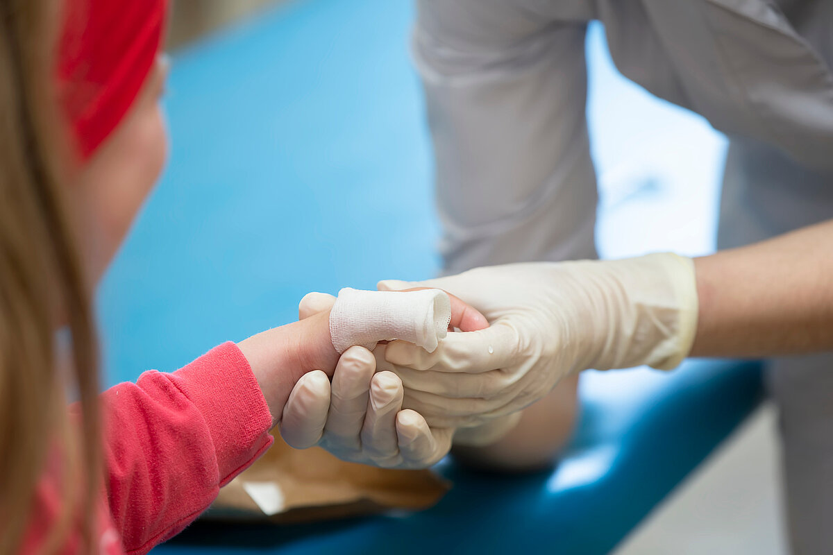 Wenn Kinder sich verbrennen oder verbrühen, ist es wichtig, Ruhe zu bewahren und das Kind zu beruhigen. Zuerst sollte in Brand geratene Kleidung mit Wasser gelöscht oder die Flammen mit einer Decke erstickt werden. Bei Verbrühungen muss die mit heißer Flüssigkeit durchtränkte Kleidung rasch, aber vorsichtig ausgezogen werden. Kleinflächige Verbrennungen, zum Beispiel am Finger, werden am besten mit handwarmem Wasser (mindestens 15 Grad Celsius) für zehn bis 15 Minuten gekühlt. Bei großflächigen Verbrennungen gilt insbesondere für Neugeborene und Säuglinge, dass nicht gekühlt werden sollte, da dies zu einer gefährlichen Unterkühlung führen kann. Besser ist es, betroffene Körperteile mit einem keimfreien Verbandtuch abzudecken. „Bei größeren Verbrennungen sollten Eltern schnell den Notruf 112 wählen“, so Ackermann. Brandsalben, Brandbinden oder Öl dürfen nicht auf die Wunde aufgetragen werden, weil sie die Hitze im Gewebe halten und so verhindern, dass die Haut mit Luft versorgt wird. Auch sogenannte Hausmittel wie Mehl, Puder oder Öl sind tabu.