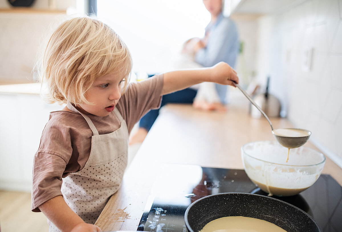 Wenn Kinder sich verbrennen oder verbrühen, ist es wichtig, Ruhe zu bewahren und das Kind zu beruhigen. Zuerst sollte in Brand geratene Kleidung mit Wasser gelöscht oder die Flammen mit einer Decke erstickt werden. Bei Verbrühungen muss die mit heißer Flüssigkeit durchtränkte Kleidung rasch, aber vorsichtig ausgezogen werden. Kleinflächige Verbrennungen, zum Beispiel am Finger, werden am besten mit handwarmem Wasser (mindestens 15 Grad Celsius) für zehn bis 15 Minuten gekühlt. Bei großflächigen Verbrennungen gilt insbesondere für Neugeborene und Säuglinge, dass nicht gekühlt werden sollte, da dies zu einer gefährlichen Unterkühlung führen kann. Besser ist es, betroffene Körper-teile mit einem keimfreien Verbandtuch abzudecken. „Bei größeren Verbrennungen sollten Eltern schnell den Notruf 112 wählen“, so Ackermann. Brandsalben, Brandbinden oder Öl dürfen nicht auf die Wunde aufgetragen werden, weil sie die Hitze im Gewebe halten und so verhindern, dass die Haut mit Luft versorgt wird. Auch sogenannte Hausmittel wie Mehl, Puder oder Öl sind tabu.