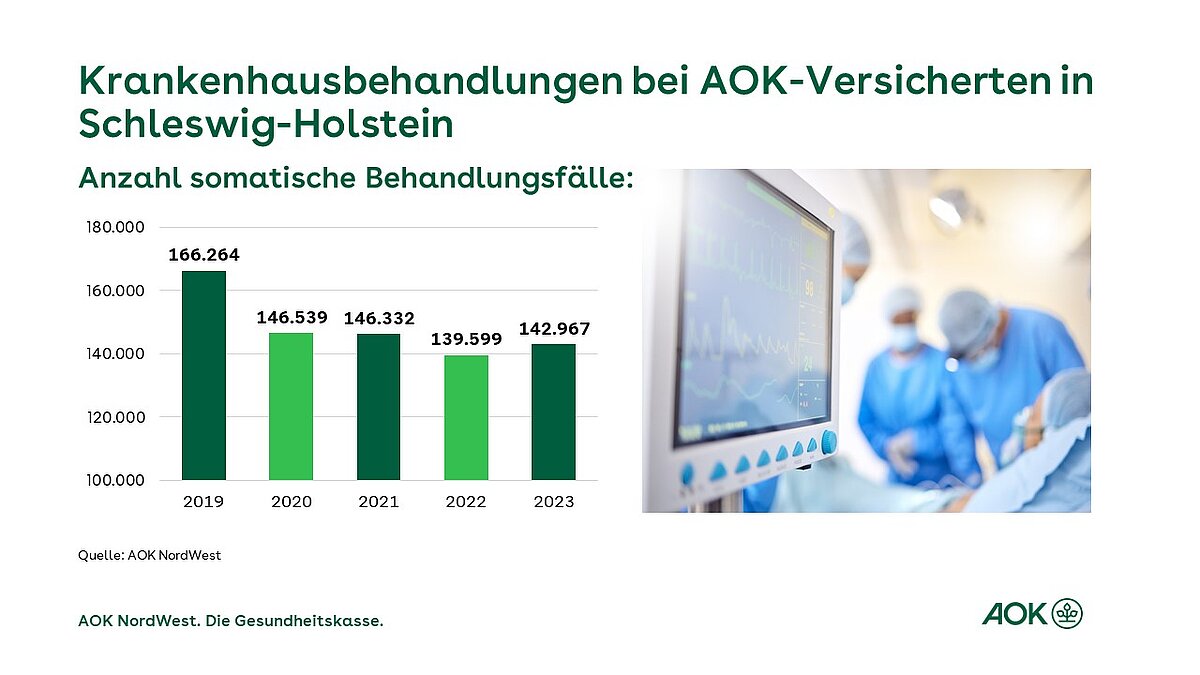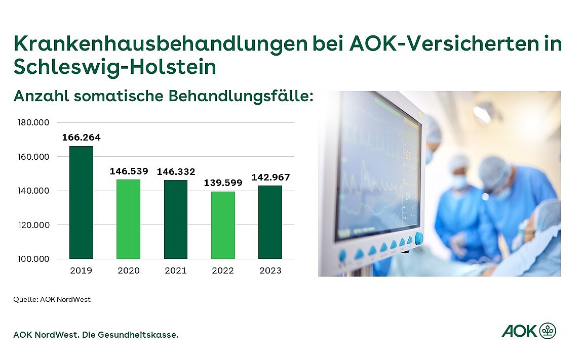 Kiel. Die Zahl der Krankenhausbehandlungen in Schleswig-Holstein ist in 2023 erstmalig nach Beginn der Corona-Pandemie wieder leicht angestiegen. Das geht aus dem neuen AOK-Krankenhaus-Report hervor. Danach legten die Fallzahlen bei somatischen Erkrankungen im Vergleich zum Vorjahr um 2,4 Prozent auf insgesamt 142.967 Behandlungsfälle bei AOK-Versicherten zu. Jedoch gegenüber 2019 vor der Corona-Pandemie betrug das Minus immer noch 14,0 Prozent. „Nach den Fallzahl-Rückgängen in der Pandemie durch die Freihaltung von Kapazitäten für schwer erkrankte Corona-Patienten und die im späteren Pandemie-Verlauf auftretenden enormen Personalausfälle ist nunmehr erstmals ein leichter Anstieg der Behandlungszahlen zu verzeichnen“, sagt AOK-Vorstandschef Tom Ackermann. Bei der anstehenden Krankenhausreform appelliert der AOK-Chef an Bund und Länder, das Ziel einer besseren Versorgungsqualität fest im Blick zu behalten. Dazu sei es nach Ackermanns Einschätzung nach wie vor notwendig, die Leistungsstrukturen der Krankenhäuser nach einheitlichen Kriterien zu definieren. „Die Mindestfallzahlen und Qualitätsvoraussetzungen sollten bundesweit verbindlich sein. Daran müssen die Länder ihre Krankenhausplanung und Versorgungsaufträge konsequent ausrichten. Die dafür notwendige Rechtsverordnung darf nicht wie vorgesehen verschoben werden, sondern muss sofort kommen“, so der AOK-Chef.
