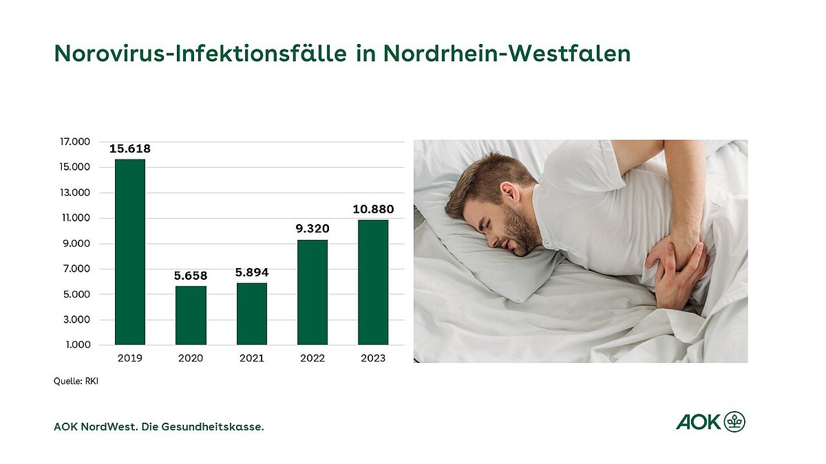 Dortmund. Die Norovirus-Infektionen in Nordrhein-Westfalen steigen weiter an. Das teilte heute die AOK Die AOK hat mit mehr als 20,9 Millionen Mitgliedern (Stand November 2021) als zweistärkste Kassenart… NordWest auf Basis aktueller Zahlen des Robert-Koch-Instituts (RKI Das Robert Koch-Institut (RKI) ist ein Bundesinstitut im Geschäftsbereich des Bundesministeriums für… ) in Berlin mit. Danach wurden im Jahr 2023 in NRW insgesamt 10.880 Fälle gemeldet, davon 5.879 Fälle in Westfalen-Lippe. Im Vorjahr waren es 9.320 Fälle in NRW, davon 5.220 Fälle in Westfalen-Lippe. Die steigende Tendenz setzt sich auch in 2024 fort: So wurden allein in den ersten fünf Wochen in NRW 2.330 Fälle gemeldet, davon 1.193 Fälle in Westfalen-Lippe. Im Vergleichszeitraum 2023 waren es 1.331 Fälle, davon 779 in Westfalen-Lippe. „Die Corona-Pandemie hatte spürbare Auswirkungen auf das Infektionsgeschehen. Mit der Normalisierung des gesellschaftlichen Lebens hat sich die Situation deutlich verändert mit der Folge wieder steigender Fallzahlen“, sagt AOK-Chef Tom Ackermann.