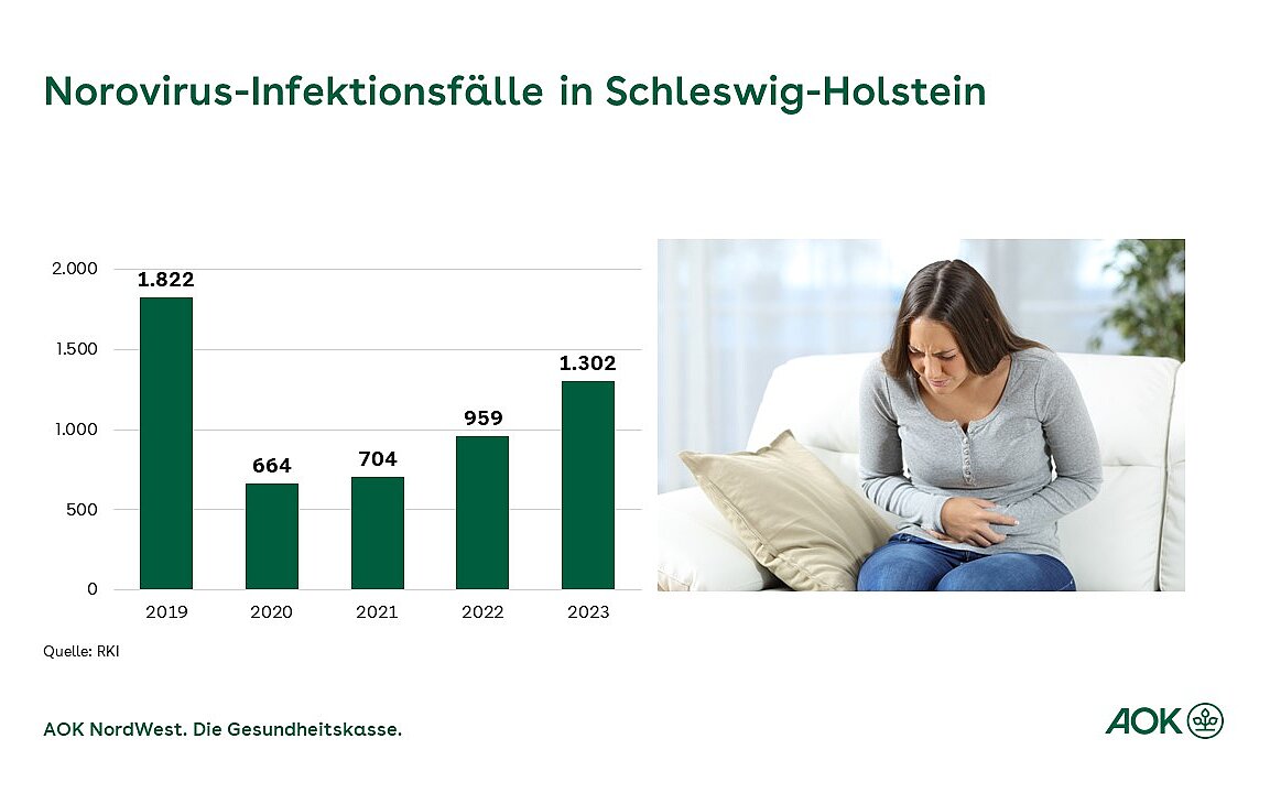 Kiel. Norovirus-Infektionen sind in Schleswig-Holstein wieder auf dem Vormarsch. Das teilte heute die AOK NordWest auf Basis aktueller Zahlen des Robert-Koch-Instituts (RKI) in Berlin mit. Danach wurden im Jahr 2023 im nördlichsten Bundesland insgesamt 1.302 Fälle gemeldet. Im Vorjahr waren es 959 Fälle. Die steigende Tendenz setzt sich auch in 2024 fort: So wurden allein in den ersten fünf Wochen 352 Fälle gemeldet. Im Vergleichszeitraum 2023 waren es nur 84. „Da es keine Impfung gegen Noroviren gibt, ist es umso wichtiger, bestimmte Hygieneregeln zu beachten, die vor den Erregern schützen können“, sagt AOK-Chef Tom Ackermann.