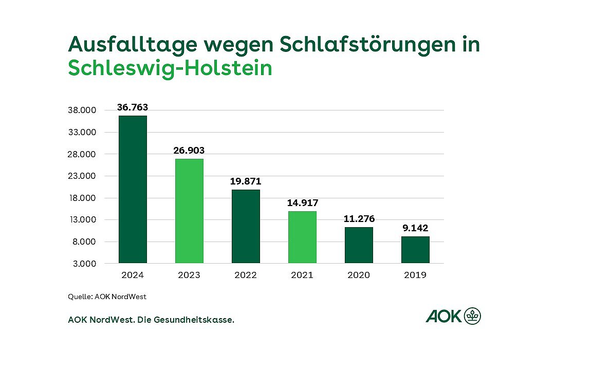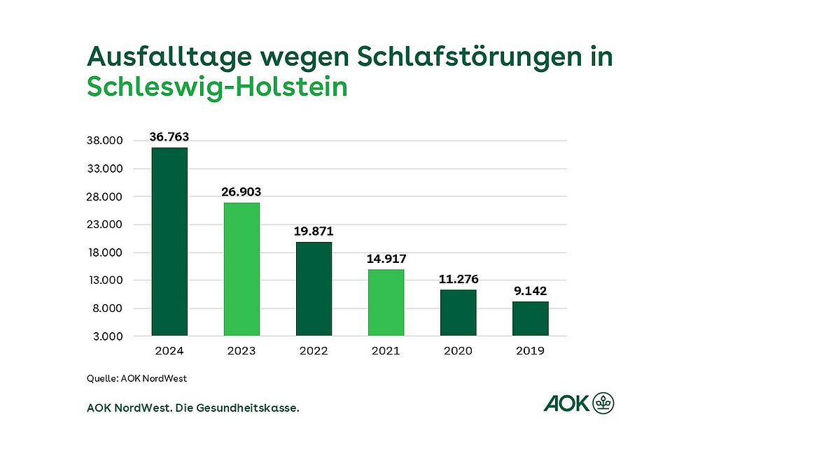 Kiel. Schlafstörungen verursachen in Schleswig-Holstein immer mehr Fehltage. Nach einem kontinuierlichen Anstieg in den letzten Jahren haben die Fehlzeiten einen neuen Höchstwert erreicht. Das zeigt eine aktuelle Auswertung der AOK NordWest. Danach verursachten nichtorganische Schlafstörungen bei AOK-versicherten Beschäftigten in Schleswig-Holstein im Jahr 2024 insgesamt 36.763 Fehltage. Das sind 36,7 Prozent mehr als noch 2023 mit 26.903 Ausfalltagen. Im Vergleich zu 2020 (11.276 Fehltage) hat sich die Anzahl die Krankmeldungen sogar mehr als verdreifacht. „Die Folgen von Schlafstörungen über einen längeren Zeitraum können gravierend sein. Daher ist die deutliche Zunahme der Fehlzeiten eine alarmierende Entwicklung“, sagt AOK-Vorstandschef Tom Ackermann anlässlich des Welt-Schlaftages am 14. März.
