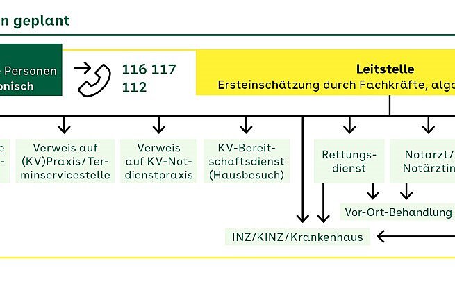 Diese Empfehlungen enthalten im Kern Regelungen zu Integrierten Leitstellen (ILS) und Integrierten Notfallzentren (INZ). Empfehlungen zum Rettungsdienst wurden explizit ausgeklammert und sollen zu einem späteren Zeitpunkt vorgestellt werden. Empfohlen wird ein flächendeckender Aufbau von ILS, bei denen die Notfallnummern 112 des Rettungsdienstes und 116 117 der Kassenärztlichen Vereinigungen (KV) zusammenlaufen, um Patienten mittels einer standardisierten Ersteinschätzung in die richtige Versorgungsebene zu steuern. Je nach Dringlichkeit soll der Notfall In Notfällen gewährleistet der Rettungsdienst lebensrettende Maßnahmen und den Transport kranker und… an die KV-Notdienstpraxis, die INZ-Notaufnahme weitervermittelt oder ein Termin in einer Arztpraxis angeboten werden. Bei zeitkritischen Fällen wären der KV-Notdienst Der ärztliche Notdienst wird durch einen Bereitschaftsdienst gewährleistet, um die ambulante… , ein Krankentransport oder die Notfallrettung die Mittel der Wahl. Angestrebt wird eine möglichst abschließende Behandlung des Notfalls. Dazu soll das Angebot der ILS erweitert werden, etwa mit telemedizinischer Beratung und der Verordnung Einige Leistungen der gesetzlichen Krankenversicherung bedürfen einer schriftlichen Anweisung durch… von Notfallmedikamenten.