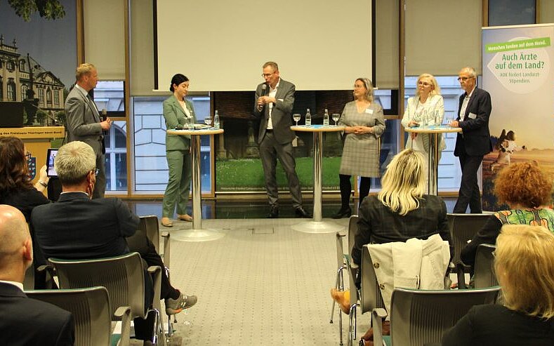 Am 11. Mai fand in der Thüringer Landesvertretung beim Bund in Berlin eine gemeinsame Veranstaltung der AOK PLUS und des Thüringer Sozialministeriums (TMASFFG) unter dem Titel „Bundesweit lenken, regional denken. Zukunftsfähige Gesundheitsversorgung aus Thüringen“ statt. Impulse setzten die Thüringer Gesundheitsministerin Heike Werner (Linke), AOK-PLUS Vorstand Rainer Striebel und die Präsidentin der Landesärztekammer Thüringen, Dr. Ellen Lundershausen. In der anschließenden Podiumsdiskussion, an der weiterhin Dr. med. Paula Piechotta (Mitglied des Bundestages, Bündnis 90/Die Grünen), Michael Weller (Abteilungsleiter im BMG) und Dr. med. Annette Rommel (Erste Vorsitzende der Kassenärztlichen Vereinigung Thüringen) teilnahmen, wurde offensichtlich, wie wichtig eine gemeinsam erarbeitete Vision für die Zukunft ist.