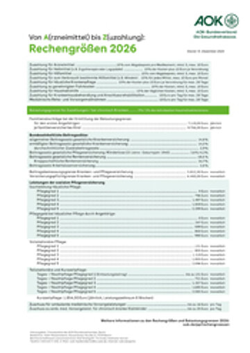 Welche Beitragsbemessungs- und Versicherungspflichtgrenzen gelten 2026? Wie sehen die Bezugsgrößen aus? Was gilt in der Pflegeversicherung und was beim Zahnersatz? Welche Regelungen sind bei der studentischen Krankenversicherung oder bei den Zuzahlungen zu beachten? In der Übersicht „Von A(rzneimittel) bis Z(uzahlung)“ sind die Rechengrößen für 2026 in der gesetzlichen Kranken- und sozialen Pflegeversicherung zusammengefasst.