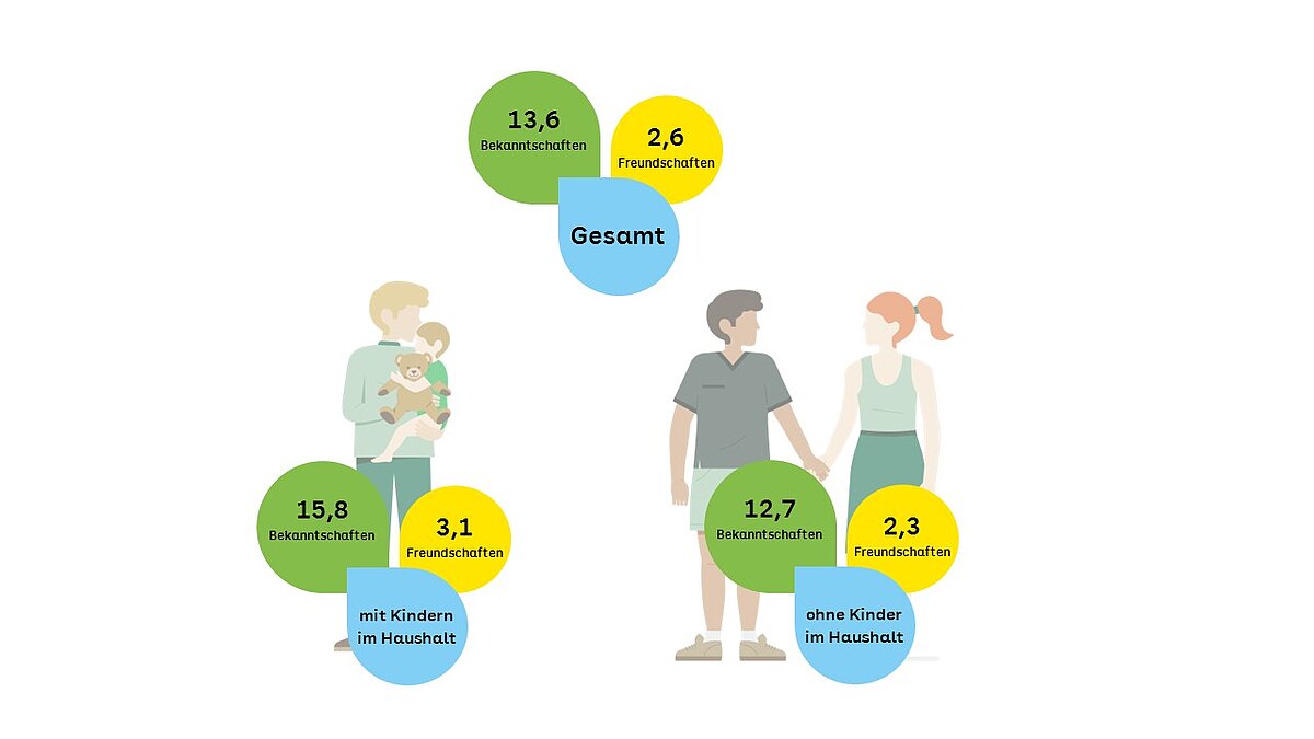 Als wahre „Nachbarschaftsmagneten“ erweisen sich Kinder: In Haushalten, in denen Kinder leben, gibt es im Durchschnitt 15,8 Bekanntschaften und 3,1 Freundschaften. Haushalte ohne Kinder kommen auf 12,7 Bekanntschaften und 2,3 Freundschaften. Zudem spielen die Wohnverhältnisse eine Rolle: Wer in einem Einfamilienhaus lebt, ist mit seiner Nachbarschaft zufriedener (75 Prozent) als jemand, der in einem Mehrfamilienhaus mit 6 bis 20 Wohnparteien lebt (59 Prozent).