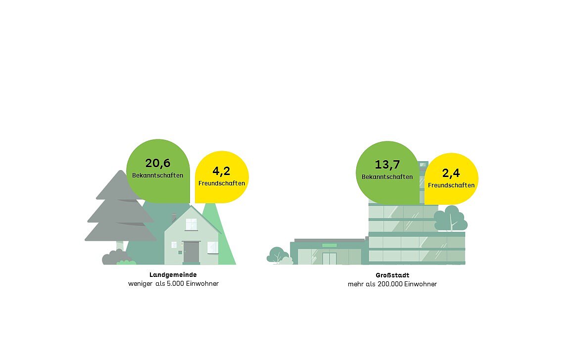 Die AOK-Studie zeigt, dass es bei Nachbarschaften in städtischen Lagen anonymer zugeht. Auf dem Land sind Nachbarschaften intensiver: Bei einer geringeren Wohndichte kennen die Menschen mehr Nachbarinnen und Nachbarn persönlich. In Landgemeinden mit weniger als 5.000 Menschen gaben die Befragten an, 20,6 Bekanntschaften und 4,2 Freundschaften in der Nachbarschaft zu pflegen. In Großstädten mit mehr als 200.000 Menschen gab es im Schnitt 13,7 Bekanntschaften und 2,4 Freundschaften im näheren Umfeld.