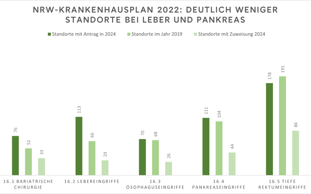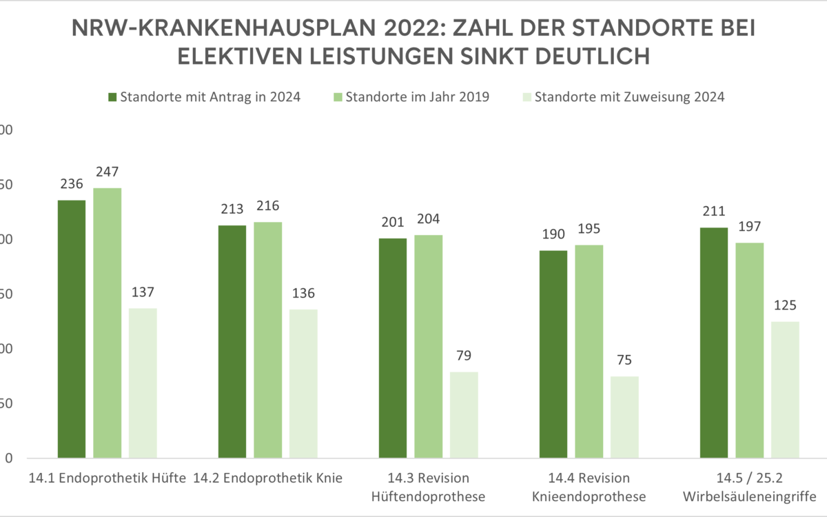 In der Grundversorgung als erster Kategorie sind die Veränderungen gering. Die zweite Kategorie mit einer bereits heute geringen Zahl an Standorten ist schon vor der Planung von hoher Konzentration gekennzeichnet gewesen. Hierunter fallen etwa Herzchirurgie und minimalintensive Herzklappenintervention, die Kinder-Hämatologie und -Onkologie, Haut- und Geschlechtskrankheiten und die Neurochirurgie. Die stärksten quantitativen Veränderungen hat NRW in der dritten Kategorie vorgenommen, in die zum Beispiel die Endoprothetik (Hüfte/Knie) fällt. Relevante Reduktionen betreffen die Viszeralchirurgie, die Kardiologie und Hämatologie und Onkologie. Im Ergebnis sinkt die Zahl der Standorte um bis zu zwei Drittel.