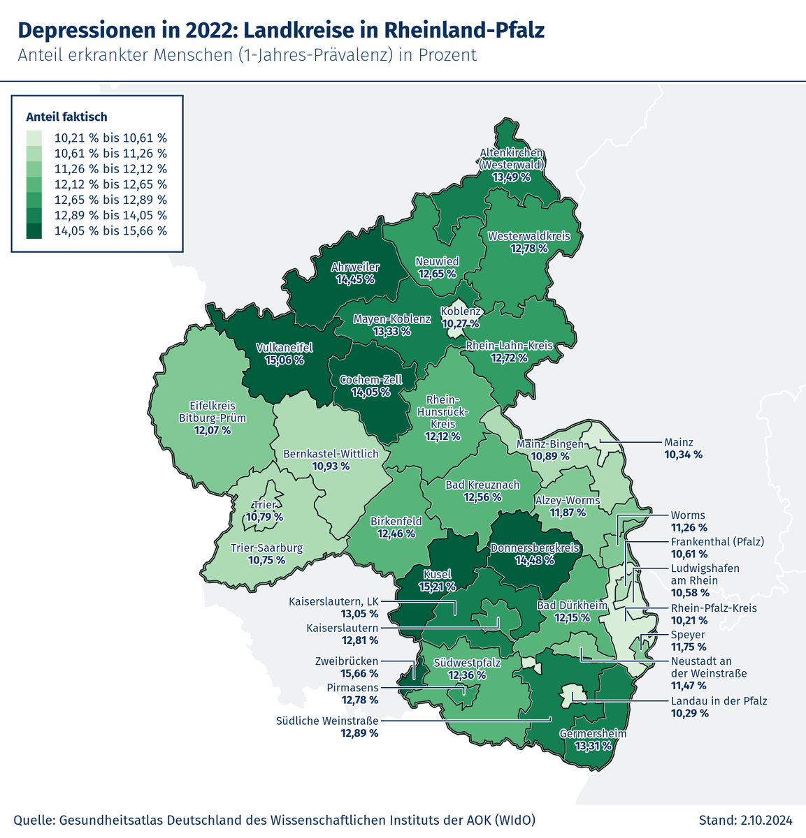 Rheinland-Pfalz liegt mit rund 12,2 Prozent Erkrankten unterhalb des bundesweiten Durchschnittswerts von 12,5 Prozent. Knapp 500.000 Betroffene in Rheinland-Pfalz waren ab dem zehnten Lebensjahr an einer Depression erkrankt. Der aktuelle Gesundheitsatlas analysiert unter anderem auch die regionale Verteilung der Erkrankung: Der niedrigste Anteil an Personen mit Depressionen findet sich mit 10,2 Prozent im Rhein-Pfalz-Kreis. Am stärksten betroffen ist Zweibrücken: Dort liegen bei 15,7 Prozent der Bevölkerung Depressionen vor.