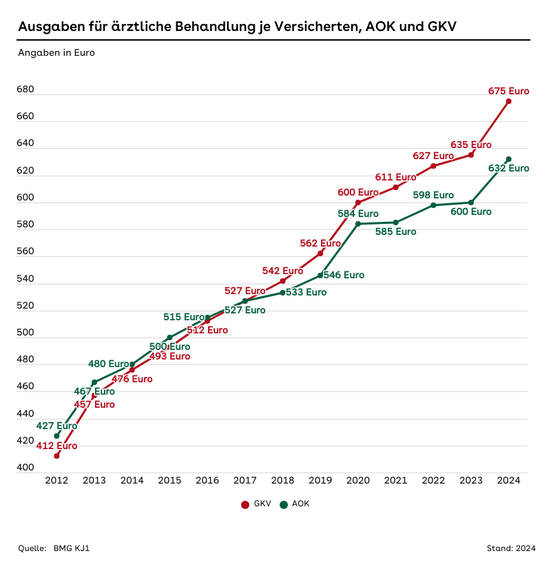 Ausgaben für ärztliche Behandlungen je versicherter Person der AOK und GKV von 2012 bis 2024.