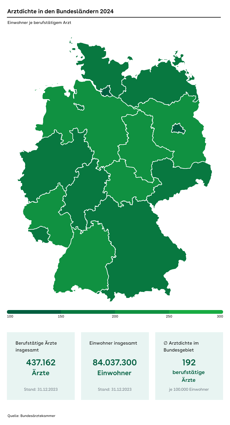 Arztdichte in den Bundesländern Deutschlands für 2024, einschließlich Bevölkerungs- und Arztzahlen.