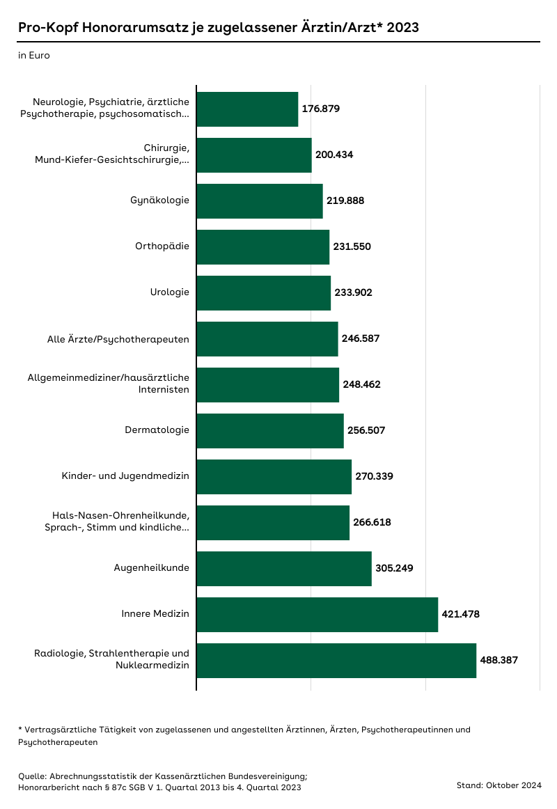 Pro-Kopf Honorarumsatz für Ärzte und Ärztinnen und Psychotherapeuten und Psychotherapeutinnen in verschiedenen Fachrichtungen 2023.