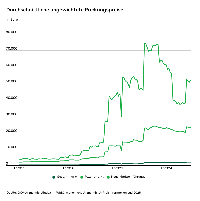 Entwicklung der durchschnittlichen ungewichteten Packungspreise im Arzneimittelmarkt von 2015 bis 2025.