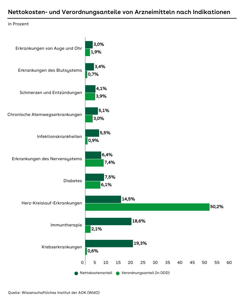 Verteilung von Nettokosten und Verordnungsanteilen von Arzneimitteln nach verschiedenen Krankheitsindikationen.