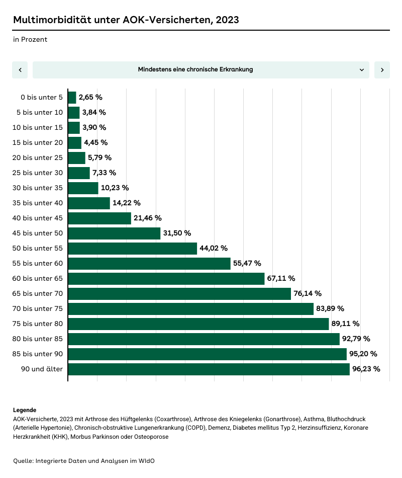Multimorbidität unter AOK-versicherten Personen im Jahr 2023, aufgeschlüsselt nach Altersgruppen.