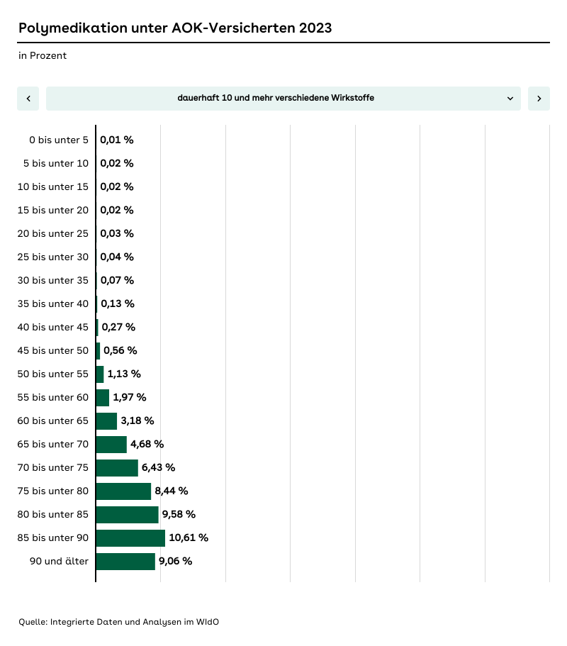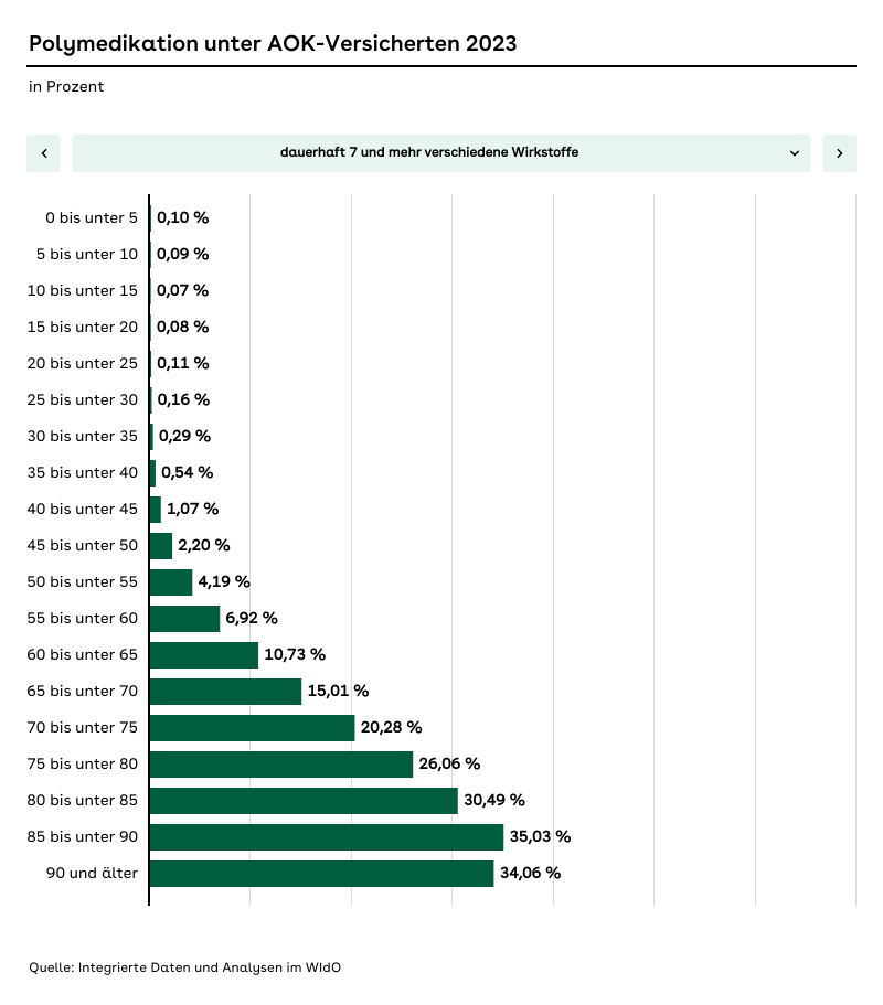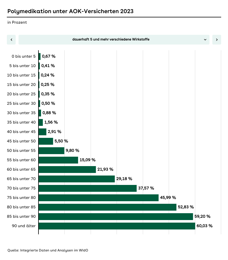 Anteil der AOK-versicherten Personen 2023, die dauerhaft verschiedene Medikamente einnehmen, aufgeschlüsselt nach Altersgruppen.