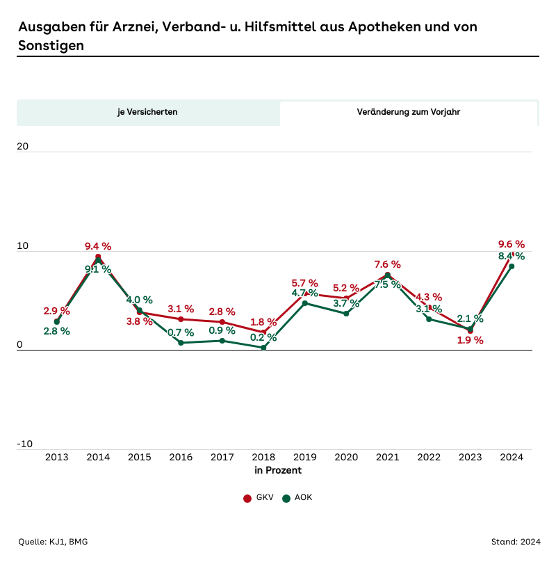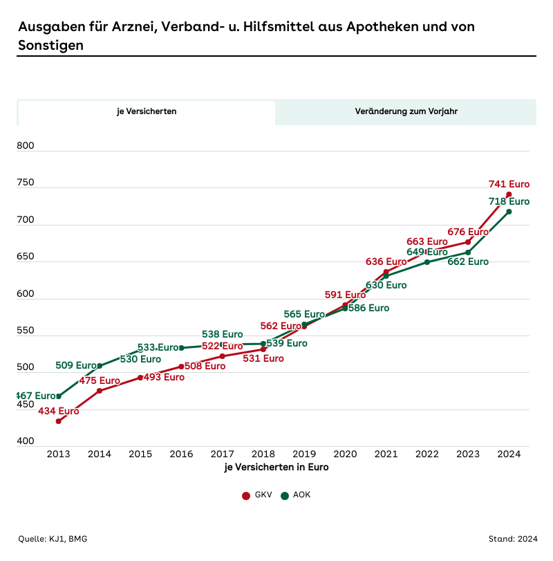 Ausgaben für Arznei- und Hilfsmittel je versicherter Person von 2013 bis 2024, einschließlich jährlicher Veränderungen.