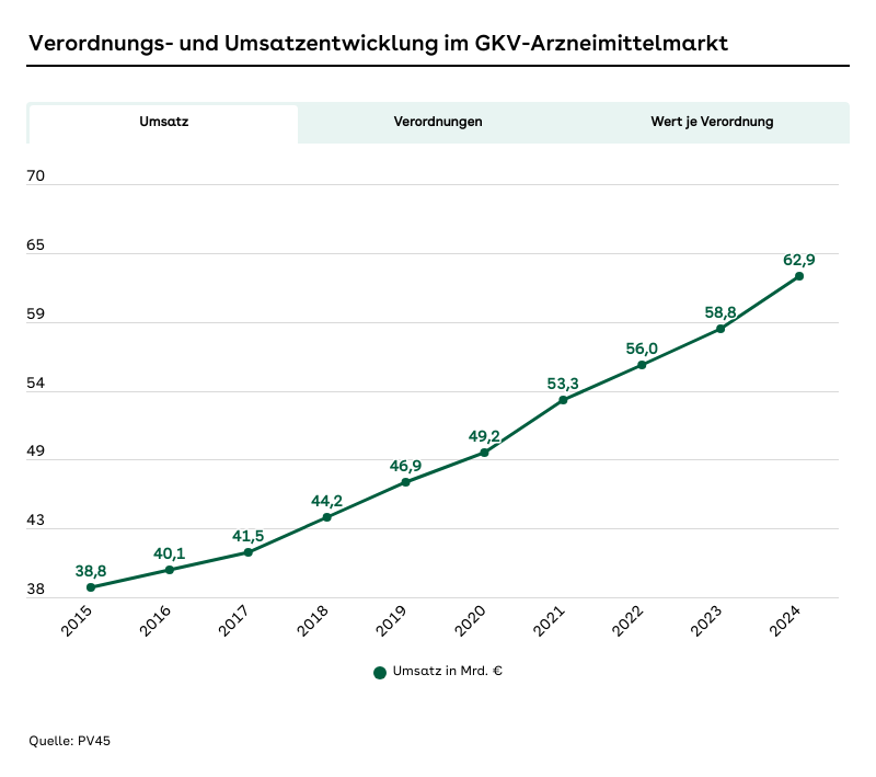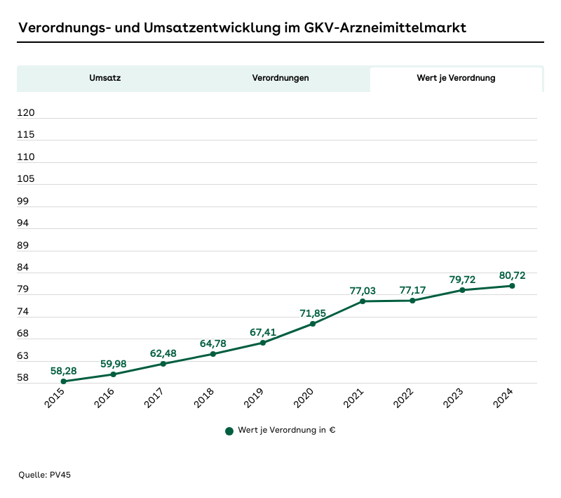 Die Verordnungs- und Umsatzentwicklung im GKV-Arzneimittelmarkt sowie der Wert je Verordnung von 2015 bis 2024.