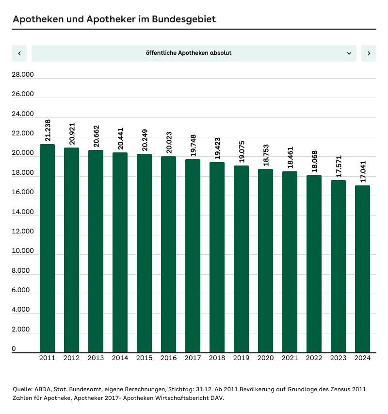 Öffentliche Apotheken absolut: Bild (.png) Einwohnende je Apotheke: Bild (.png) Apotheker/-innen in öffentlichen Apotheken: Bild (.png) Apotheker/-innen je 100.000 Einwohnende: Bild (.png)