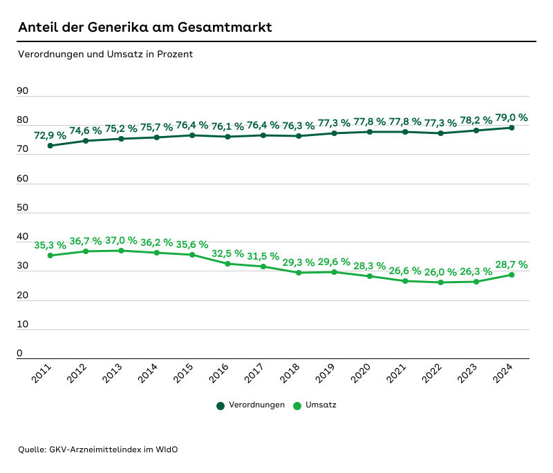 Anteil von Generika am Gesamtmarkt in Prozent von 2011 bis 2024.