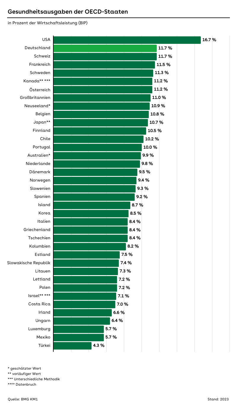Gesundheitsausgaben der OECD-Staaten in Prozent der Wirtschaftsleistung (Bruttoinlandsprodukts, BIP) für 2023.