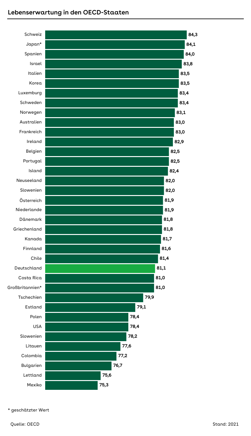 Lebenswerwartung in den OECD-Staaten im Jahr 2021.